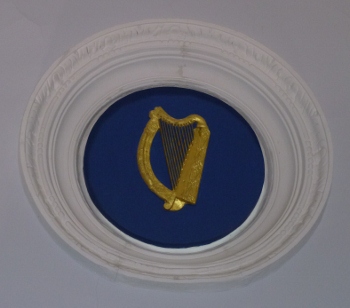 One of the first things to catch the eye of the visitor is a large painting in the entrance hallway by a Chinese artist Zhao Shao Rou dated 11-11-2011, when President Higgins was inaugurated at Dublin Castle.  The hall with its barrel-vaulted ceiling dates from 1751. One of the features is the golden harp on a blue background which is the same as the presidential standard.
