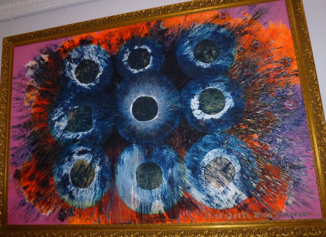 One of the first things to catch the eye of the visitor is a large painting in the entrance hallway by a Chinese artist Zhao Shao Rou dated 11-11-2011, when President Higgins was inaugurated at Dublin Castle. The hall with its barrel-vaulted ceiling dates from 1751. One of the features is the golden harp on a blue background which is the same as the presidential standard.
