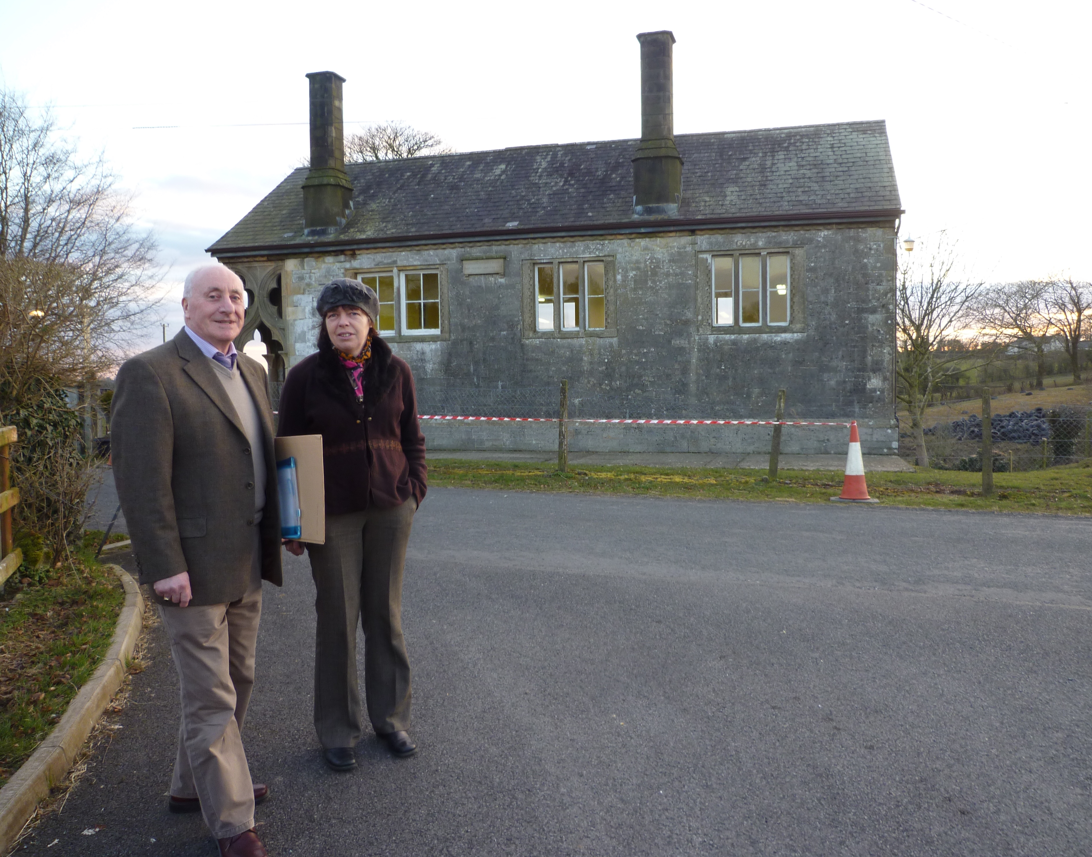 The sun was setting around Bragan as a crowd of over fifty people gathered at the former National School at Cornagilta, a few miles from Tydavnet, for an evening devoted to the history of what was once part of the Rose estate. Since 2001 when the late Canon Jackie Gilsenan was Parish Priest of Tydavnet, a group of locals has been working hard to preserve the building, which has some interesting stonework features, particularly at the entrance.