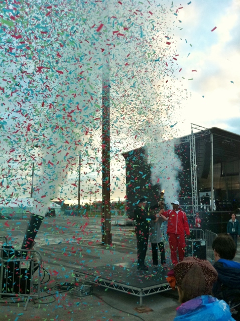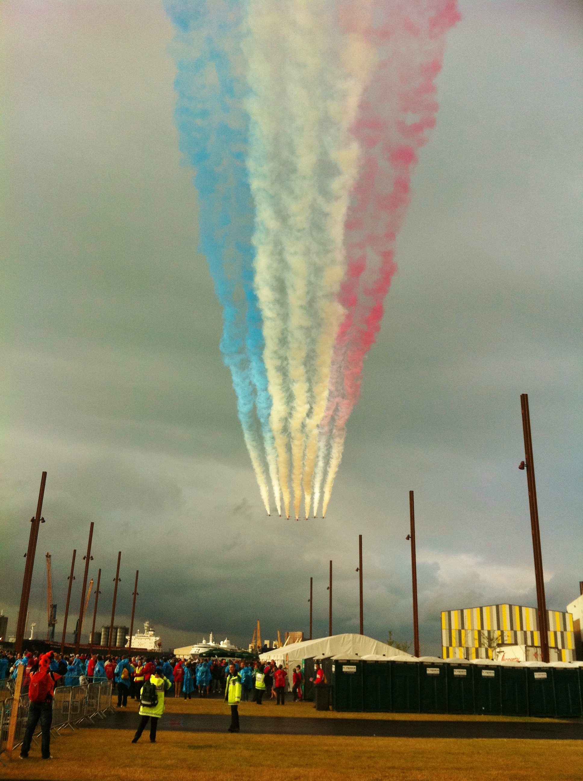 The Red Arrows having just taken part in an air show in Newcastle, County Down, flew low over the Titanic Quarter in Belfast leaving behind a trail of red, white and blue smoke in a spectacular start to the closing ceremony of the 2013 World Police and Fire Games. In the background the cruise ship Silver Cloud was berthed on a one-day stopover.