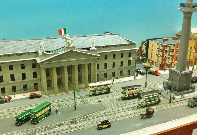 O’Connell Street: This layout is a 4mm scale (1:76) representation of the capital’s main street and its trams as it was in the last year of tramway operated in 1949. The buildings on the west side of the street were modelled using ordnance survey maps and photographs of the period. The civic monuments including the Nelson Pillar grace the centre of the street. Many figures of people in the model including cyclists, horse transport and “internal combustion engine vehicles” sharing space with working trams, busses and trucks.