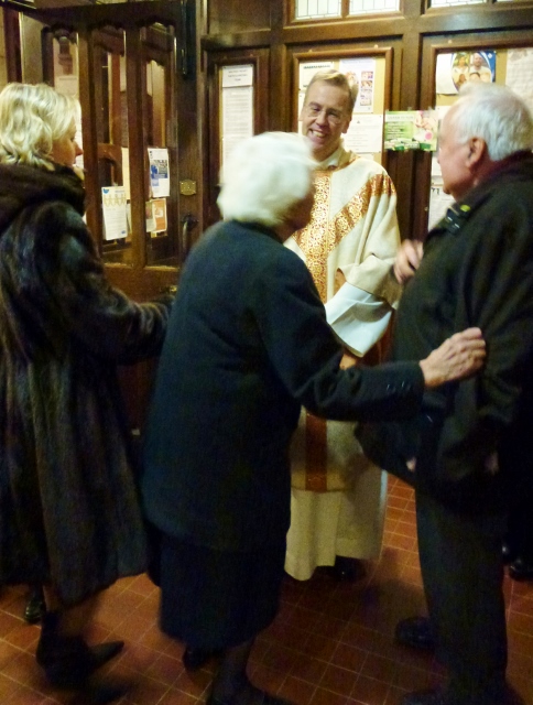 Mgr Nick Hudson is congratulated by parishioners after his first Mass as new PP Photo: © Michael Fisher