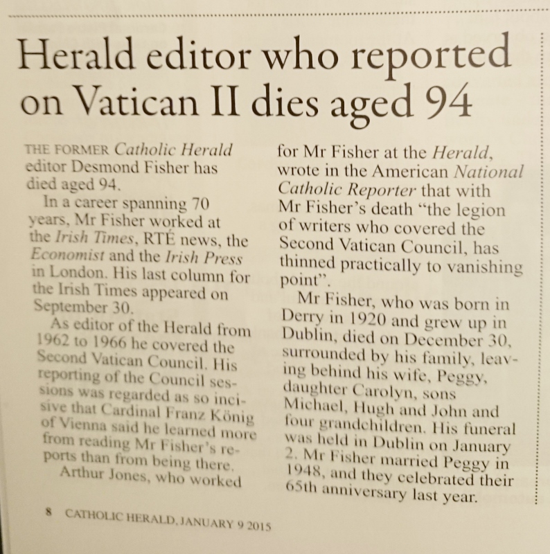 As editor of the Herald from 1962 to 1966 he covered the Second Vatican Council. His reporting of the Council sessions was regarded as so incisive that Cardinal Franz König of Vienna said he learned more from reading Mr Fisher’s reports than from being there.
