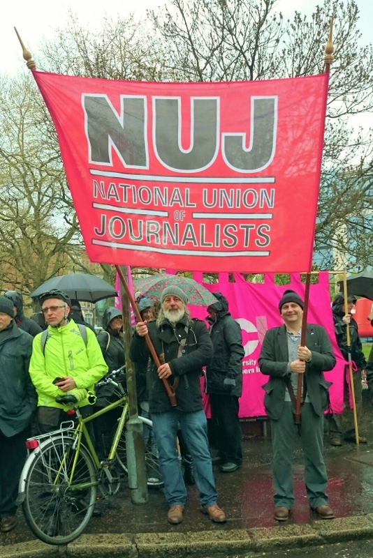 NUJ Belfast and District Branch: Robin Wilson, Bob Miller (Chair) and Joe Mitchell await the start of the parade Photo: © Michael Fisher