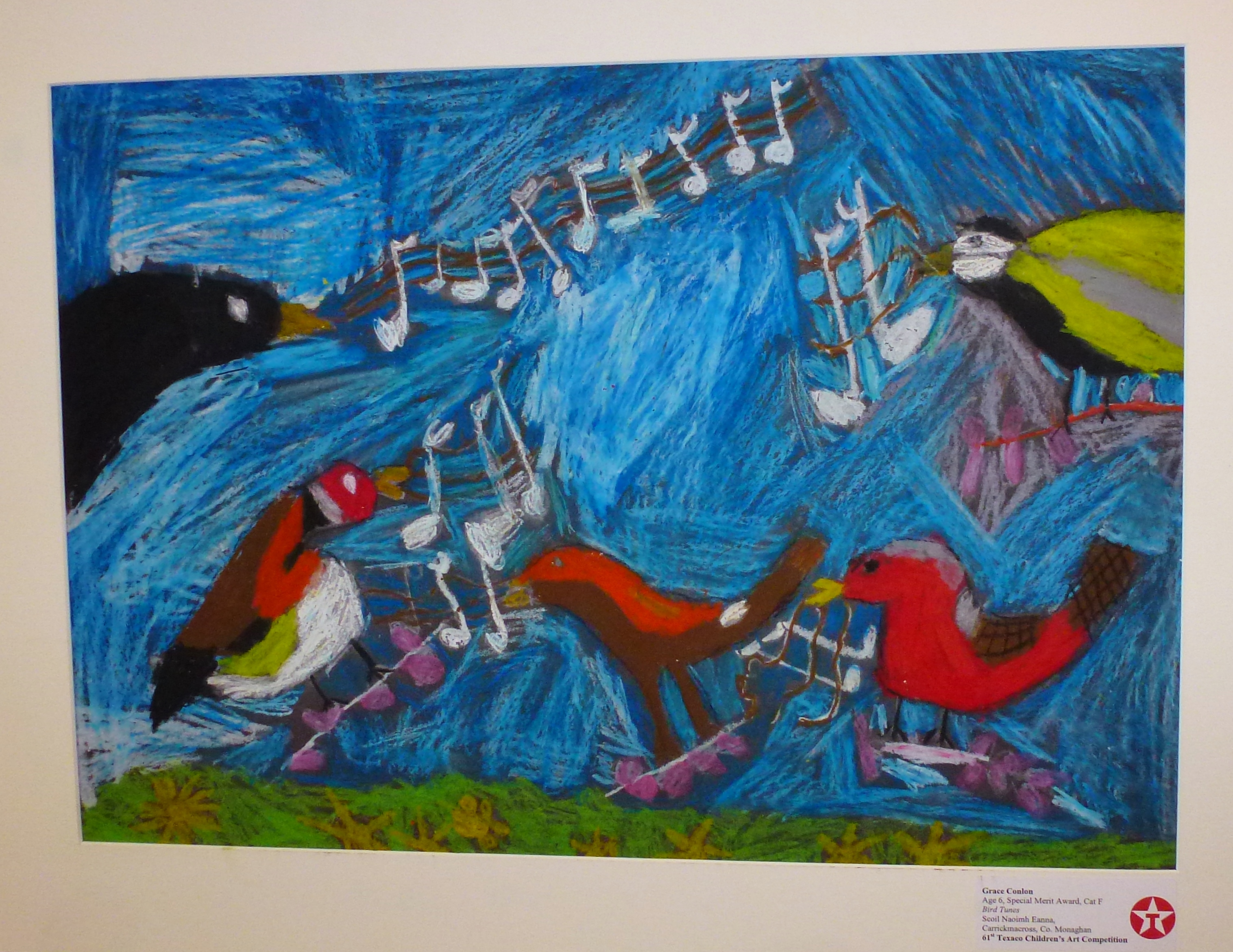 In the younger age groups, there was a remarkable success by three pupils from the same school near Carrickmacross, Scoil Naoimh Éanna in Killanny. Sophia Goodman, aged 7, came third in the 7-8 years age category. She won a €125 art voucher for her entry entitled “The Nice Flowers”. In the same category, Kate Norton (7) who painted “The Cute Kittens” got €50 and an art box while Grace Conlon (6) got €30 and an art box for her work “Bird Tunes”. Both received Special Merit Awards.