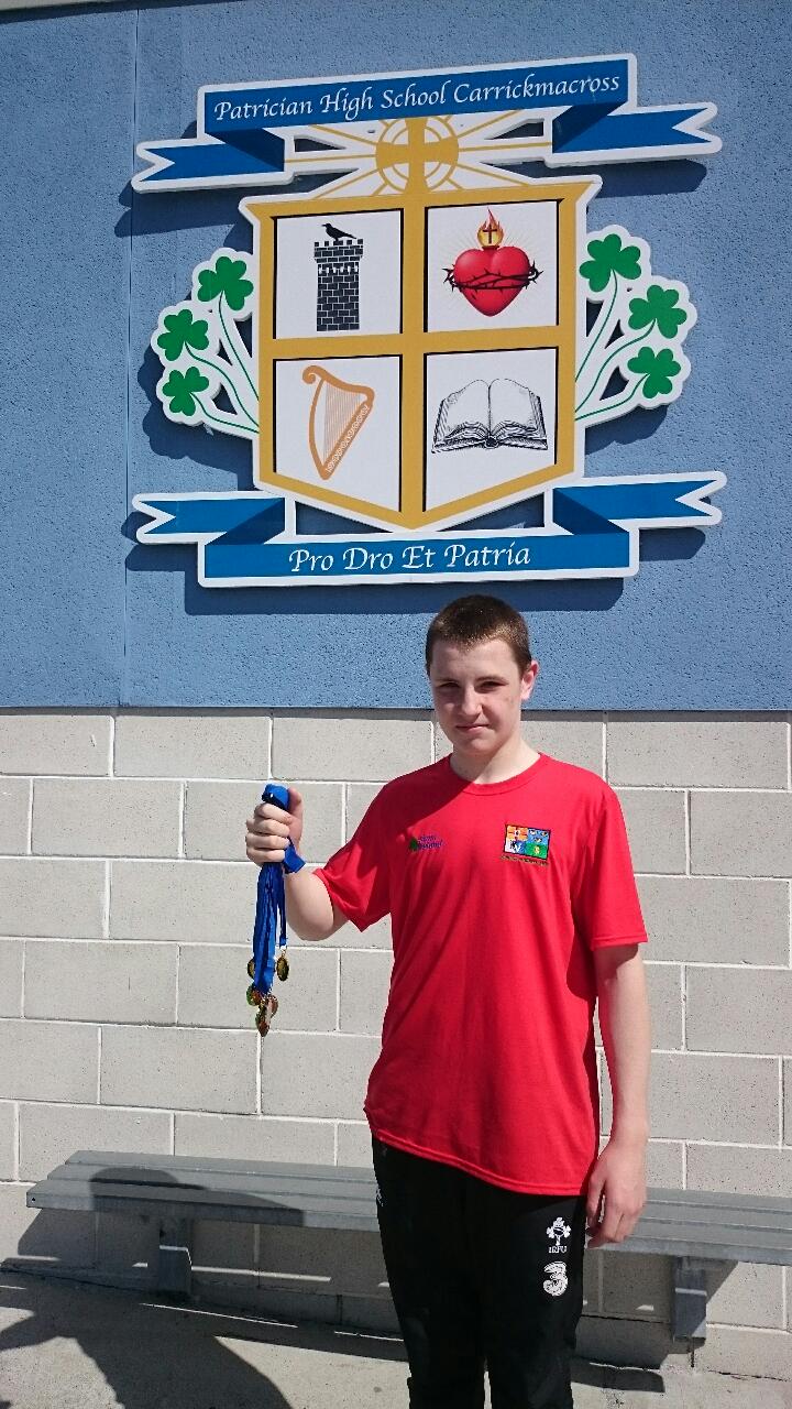 It was as a 7 year-old taking part in the community games that Cathal first swam competitively. His mother had taken him to Dundalk for swimming lessons as a 5 year-old. At the start, he didn’t like them at all but he gradually got used to the water and has never looked back since. Cathal is the eldest of four children. As well as Aoife, he has another sister Kaitlin, aged 7, who also attends St Daigh’s school. The youngest in the family is 4 year-old Sean. As Cathal left Patrician High School where I met him, the Principal Joe Duffy came across and congratulated him on his sporting achievements. Hopefully he will bring back more medals to County Monaghan in future.