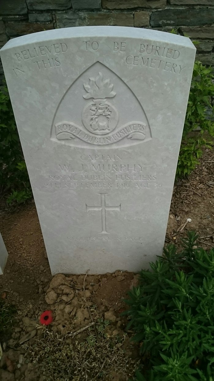 Captain William Joseph Murphy of the 9th Battalion Royal Dublin Fusiliers died on 9th September 1916, aged 36. He was mentioned in despatches. He was the son of Edward and Mary Murphy from Tullow in Co. Carlow. Joined the Cadet Corps, Leinster Regiment, in November 1914; appointed Lietenant in the 9th Dublins the following month and was promoted to Captain in March 1915.