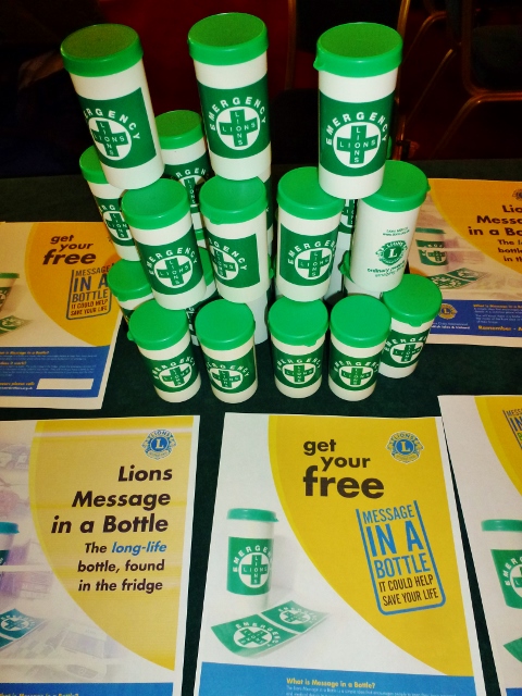 One of the projects I had in mind when Belfast Lions Club was revived three years ago was the ‘Message in a Bottle’ scheme which I had been encouraged to adopt by Dan Hurst of Dún Laoghaire Lions. With their help, the Club took on the scheme as its first service project. It provides a potentially life-saving object, a bottle with a form inside carrying a person’s medical details, for those most in need, such as elederly people living on their own. The bottle is placed in the refrigerator and a special green sticker is stuck on the door and near the front door in order to alert emergency services such as paramedics that this important information is safely stored inside.