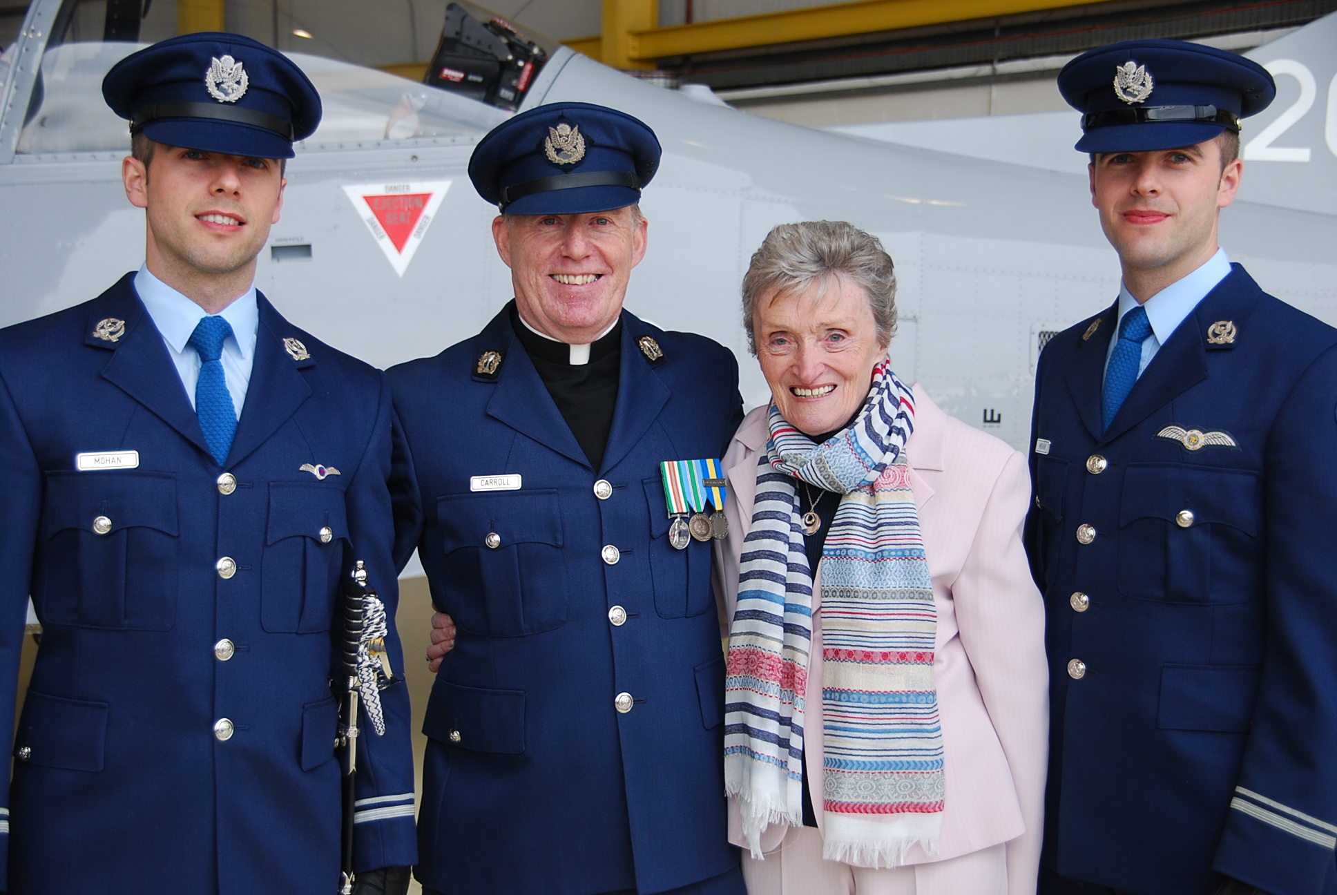 Lieutenants Frankie and Eugene Mohan with Air Corps Chaplain Fr Jerry Carroll and their grandmother Teresa Mohan from Carrickmacross. Photo courtesy of Brian Mohan