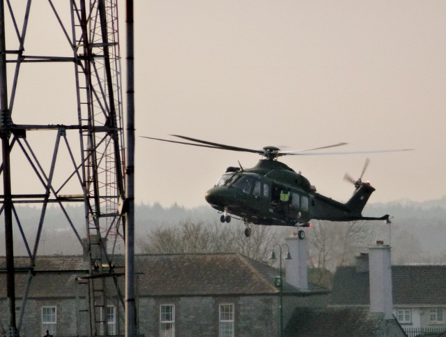 My picture of an AgustaWestland AW139 was taken this afternoon in Athlone. It is one of six such aircraft in the Air Corps fleet. The observation point was from the Castle, looking across towards Custume Barracks. Until last year, it was the headquarters of Western command, but under reorganisation the 1,000 soldiers based there became part of what is now 2nd Brigade, with headquarters at Cathal Brugha Barracks in Dublin. The helicopter is providing an air ambulance service (Emergency Aeromedical Service) with air corps crew and one HSE paramedic on a trial basis until June. At the moment the EC-135 helicopter normally used is being rebuilt after an accident and the Westland helicopter operates from Baldonnel, Co. Dublin.
