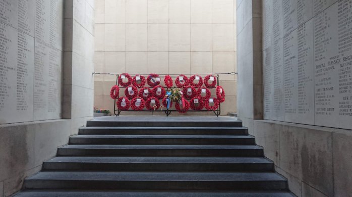 The inscription inside the archway is similar to the one at Tyne Cot, with the addition of the Latin phrase meaning ‘To the Greater Glory of God”: Ad Majorem Dei Gloriam – Here are recorded names of officers and men who fell in Ypres Salient, but to whom the fortune of war denied the known and honoured burial given to their comrades in death”. Both this inscription, and the main overhead inscription on both the east- and west-facing façades of the arch, were composed by Rudyard Kipling.
