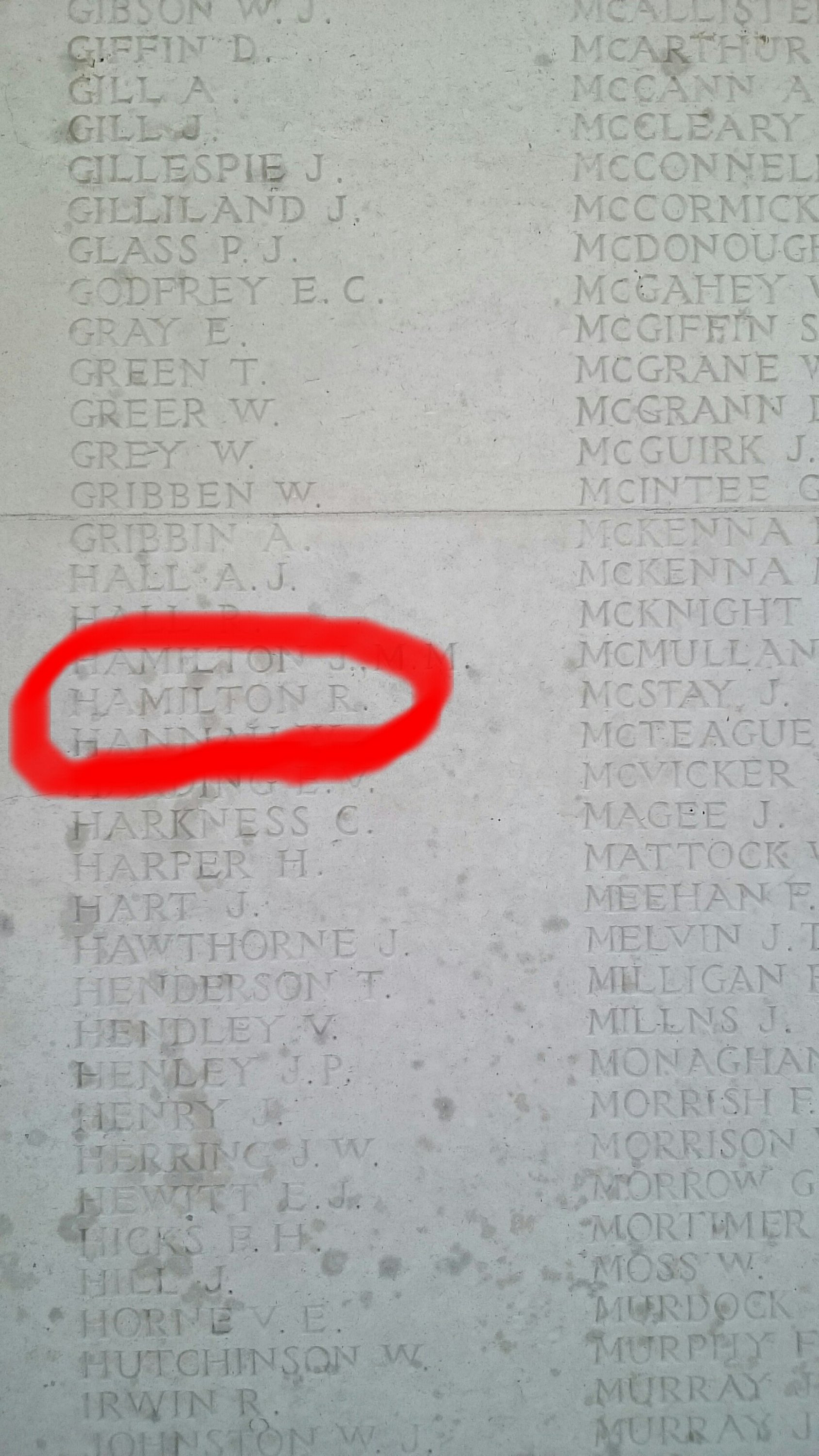 The unveiling of the Ulster History Circle blue plaque for Private Hughes in Castleblayney was attended by his niece Josephine (Hughes) Sharkey from Dundalk, and her daughter Siobhan. Other relatives included PJ McDonnell, (originally from Broomfield), Chair of the Monaghan Association in Dublin. His father’s mother and the mother of Thomas Hughes were sisters. Other relations came from the Donaghmoyne area, including Ann Christy, a grand niece, Brian Conway from Castleblayney, Pauline McGeough (Broomfield), Rosemary Hughes-Merry (Castleblayney), Angela McBride from Carrickmacross and a distant cousin, Frank Hughes, originally from Laragh.