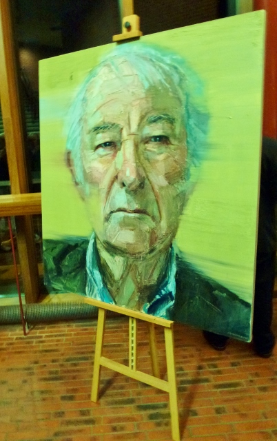 The portrait was on display at the Lyric theatre in Belfast on Saturday night. A full house attended a special commemoration put together at short notice by theatre trustee Stuart Douds. It included a rendition of Port na bPúcaí, a tune that inspired Heaney to write The Given Note, by cellist Neil Martin, who also played at the poet’s funeral. There were  readings by some of his fellow poets and friends. Robert McMillen who I met before the commemoration gave this summary of the participants:-