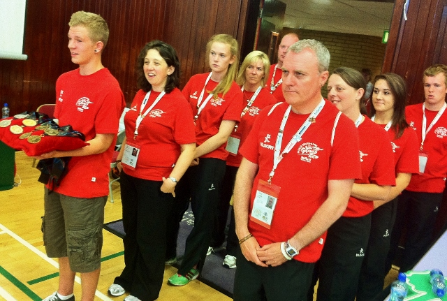 At each medal ceremony a team of volunteers was ready to help. They appeared at the Odyssey for the first medals in the novice section of the ice hockey on Tuesday 30th July, two days before the official start of the games. Then a team turned up at the Valley Leisure Centre in Newtownabbey for the table tennis medals presentations, two on Friday and two yesterday. Newtownabbey Mayor Fraser Agnew and Alastair Ross MLA were the guests on Friday. Yesterday the first ceremony at lunchtime featured the deputy Mayor Dineen Walker and for the last presentation we were joined by the Justice Minister David Ford MLA.