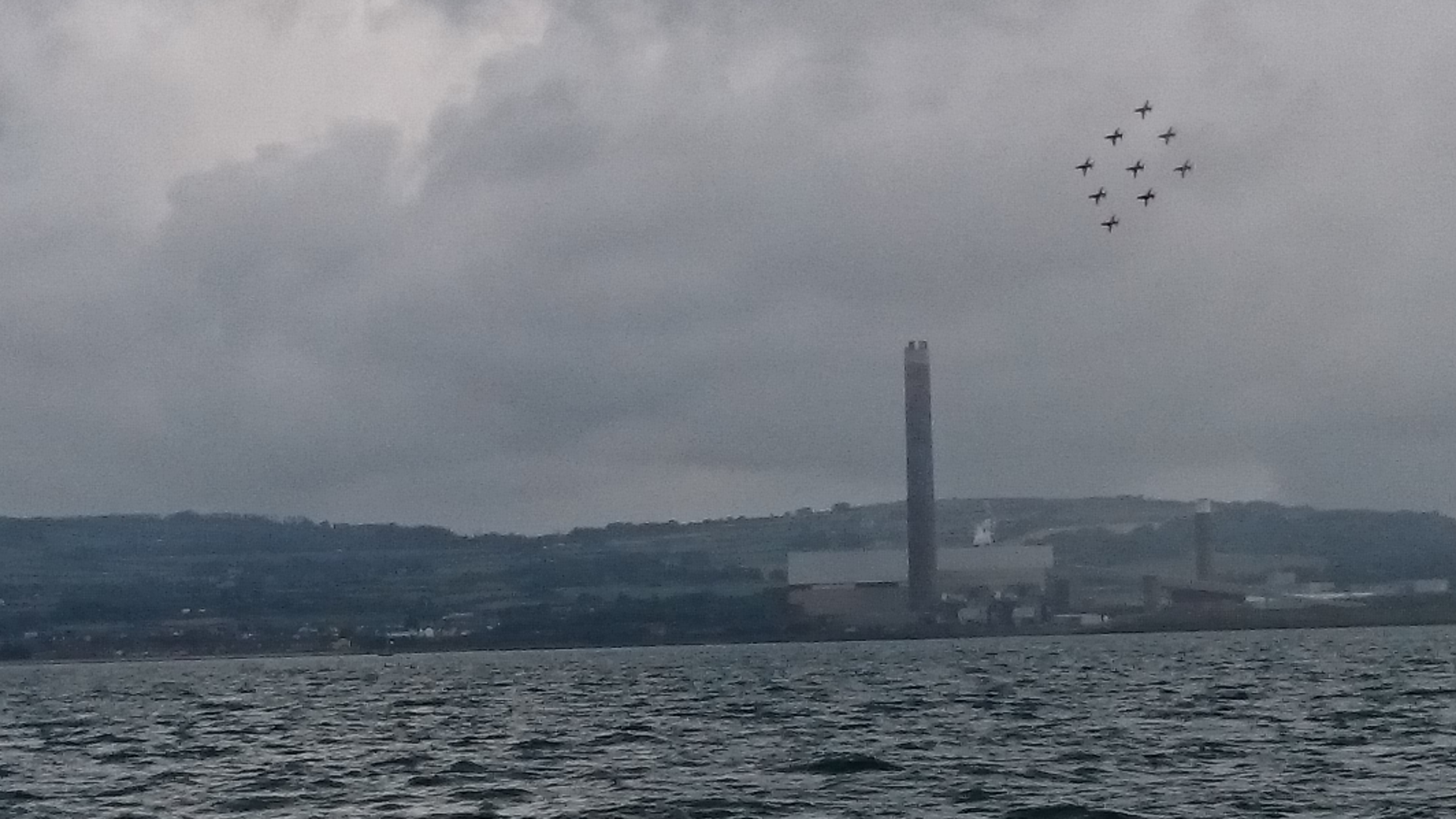 I had never been to sea on such a vessel before and did not know what to expect but skipper Michael Brogan from Kinvara and his crew made me welcome. There was a bit of rain as we left Belfast Lough but by the time we were off Carrickfergus, passing the Kilroot power station, we were in an excellent position to enjoy the aerial acrobatics of the Red Arrows display team.