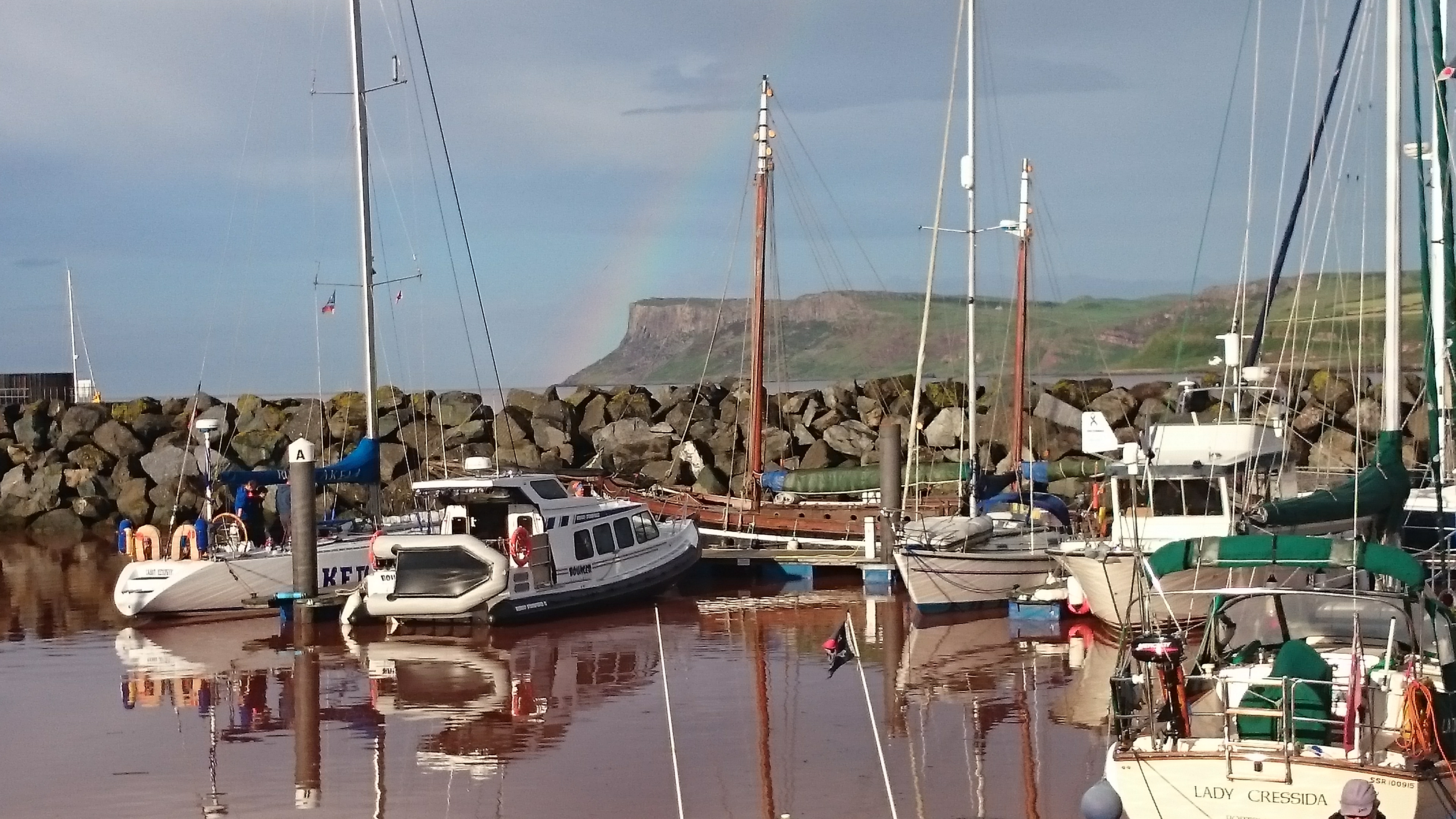 As we stepped onto dry land again, the sun came out and a rainbow could be seen above Ballycastle and also further away at Fair Head.